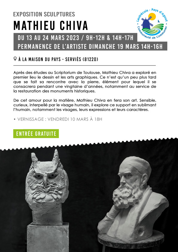 Après des études au Scriptorium de Toulouse, Mathieu Chiva a exploré en premier lieu le dessin et les arts graphiques. Ce n’est qu’un peu plus tard que se fait sa rencontre avec la pierre, élément pour lequel il se consacrera pendant une vingtaine d’années, notamment au service de la restauration des monuments historiques.
