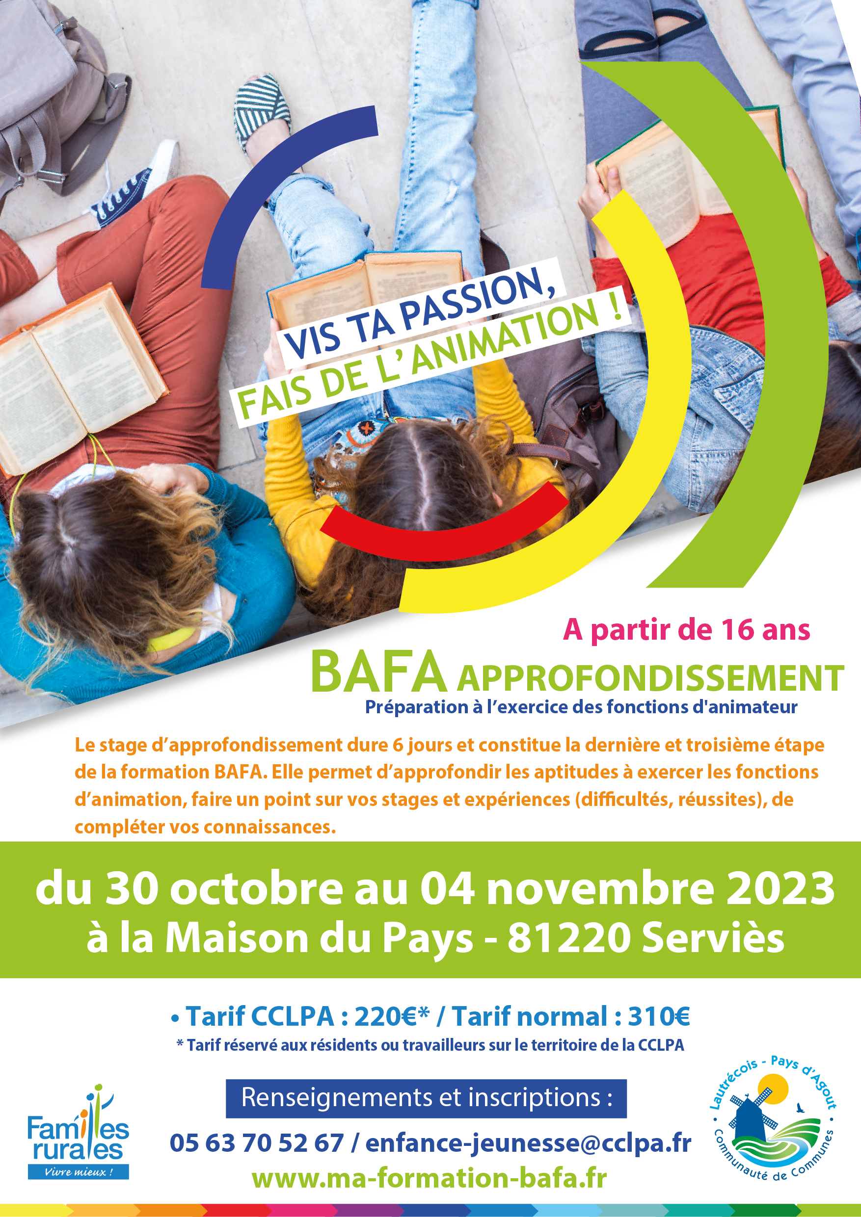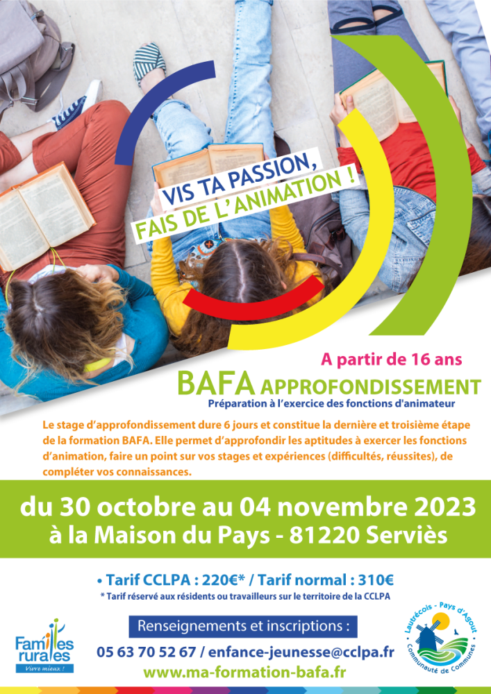 Tu as 16ans ou plus, tu as déjà réalisé la première partie de la formation BAFA ? Inscris-toi pour la session du 30 octobre au 04 novembre 2023, à la Maison du Pays de Serviès. (Inscriptions au 05 63 70 52 67 / enfance-jeunesse@cclpa.fr)