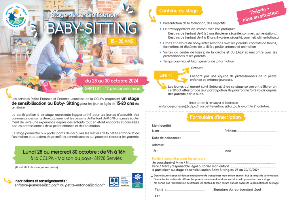 Les services Petite Enfance et Enfance-Jeunesse de la CCLPA proposent un stage de sensibilisation au Baby- Sitting pour les jeunes âgés de 15 à 20 ans du territoire.
