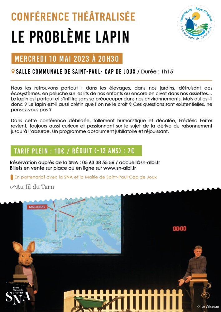 Conférence théâtralisée " Le problème Lapin" le mercredi 10 mai à 20h30 à la salle communale de Saint-Paul Cap de Joux - Durée 1h15